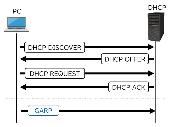 DHCPの規格では以上で終了ですが、割り当てられたアドレスがネットワーク上で重複していないかを確認するために、OSはGARP(Gratuitous ARP)を送信します。これにより同一セグメント内でのアドレス競合を検出できます。