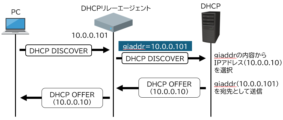 DHCPサーバはgiaddrを参照して適切なアドレスを選び、DHCP OFFERをリレーエージェントに返します。
