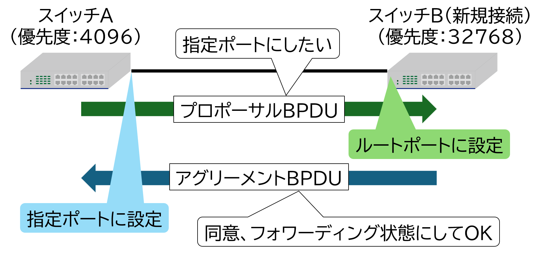 優先度が低いスイッチングハブ(スイッチB)は、自身のポートをルートポートに設定し、「同意、フォワーディング状態にしてよい」という内容の アグリーメントBPDU をスイッチAに返信します。