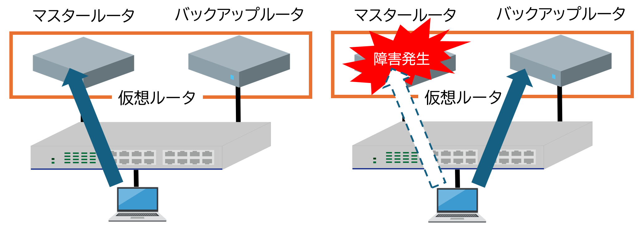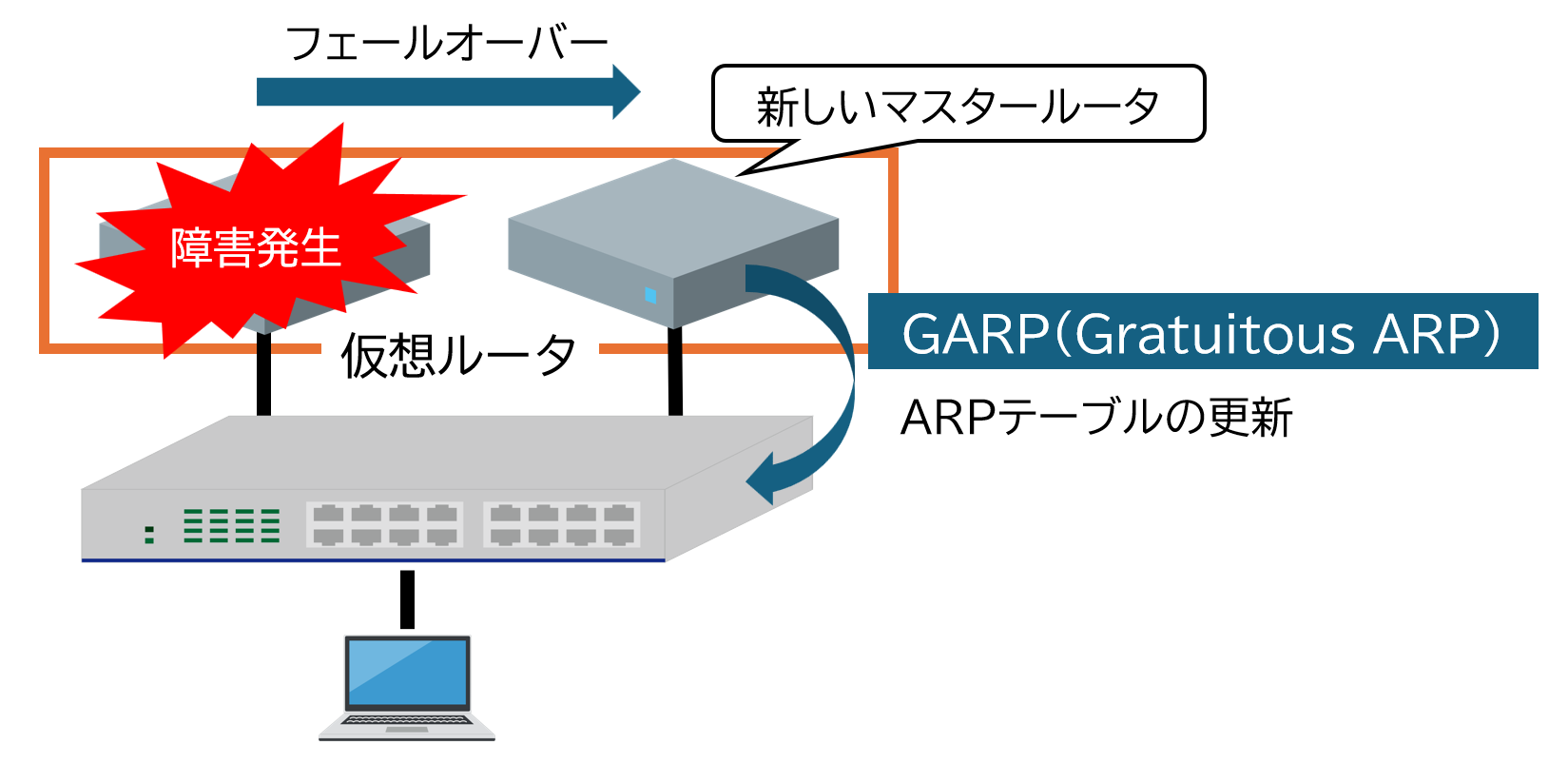 フェールオーバー時には、バックアップルータの中から優先度が最も高いルータが新しいマスターに昇格し、仮想IPアドレスを引き継ぎます。その際、GARP(Gratuitous ARP) を送信して、同一セグメント内のスイッチに対してARPテーブルを更新させ、通信を途切れさせないようにします。