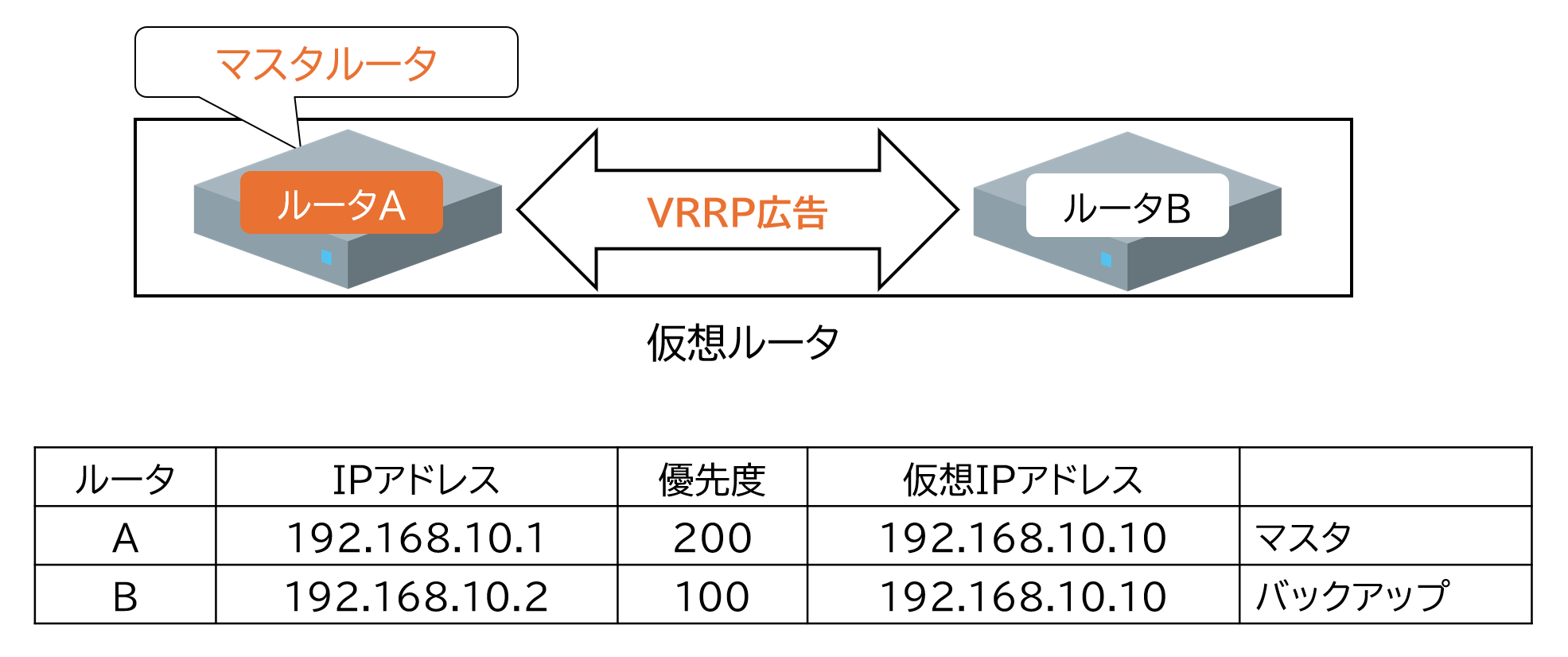 ルータはお互いにVRRP広告(アドバタイズメント) を定期的に送信し合い、自分の存在と優先度を通知します。その結果、もっとも優先度の高いルータだけがマスタールータとして広告を継続して送信し、他のルータは広告を送信せず「バックアップ」として待機します。